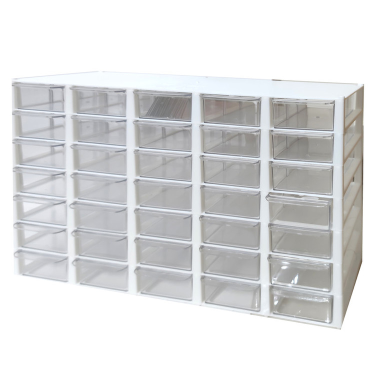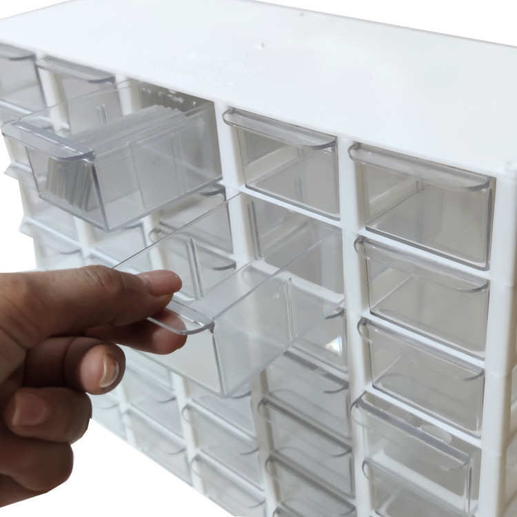 جعبه ابزار 35 کشو کریستالی که در 7 طبقه ساخته شده است از جعبه ابزارها یا جعبه قطعات های چند منظوره به حساب می آید. هر کشو از این جعبه به صورت شفاف و کریستالی می باشد به همین دلیل در تشخیص قطعات داخل هر کشو بسیار موثر است.هر کشو دارای لبه کوچکی است تا بوسیله این لبه کشو ها را عقب و جلو کرد.ناگفته نماند که کشو ها بسیار روان عقب و جلو می شوند.ابعاد کشوها 11x5x3.5 سانتی متر می باشد و فضای کافی برای انواع قعات، ابزار، وسایل را دارد. ویژگی عالی این جعبه ابزار یا جعبه قعات دارد این است که محدود به یکسری از اجناس نمی شود و برای تمامی مشاغل کاربردی ایست. برای مثال می توانید قطعات کارگاهی،ابزار آلات،اسباب بازی،طبقه بندی خشکبار،وسائل کمکهای اولیه،نمونه های معرفی محصولات... در این جعبه ابزار قرار داد و از آنجایی که می توانید در کشو ها لیبل گذاری کنید، این جعبه ابزار کمک به سزایی در مرتب کردن و نظم دادن وسایل شما میشود.جنس بدنه جعبه ابزار از نوع پلاستیک باکیفیت و جنس کشوها به صورت کریستالی می باشد.