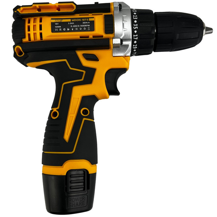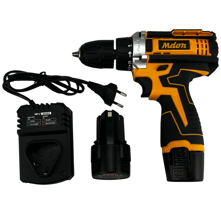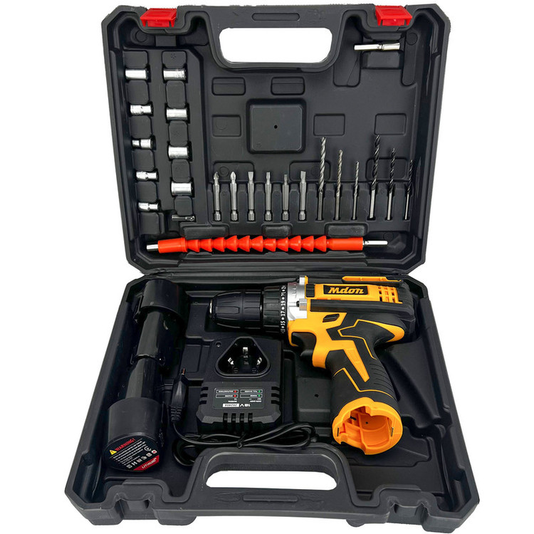 دو عدد باطری 18 ولت/ شارژر /مته اهن سایز 4 و 5 و 6 /مته چوب سایز 4 و 5 و 6/ سری پیچ گوشتی 6 عدد (2عدد دوسو/2عدد چهارسو/2عدد الن ستاره ای) /سری بکس از سایز 5 تا 13 /یک عدد رابط فنری و 2 عدد رابط بکس