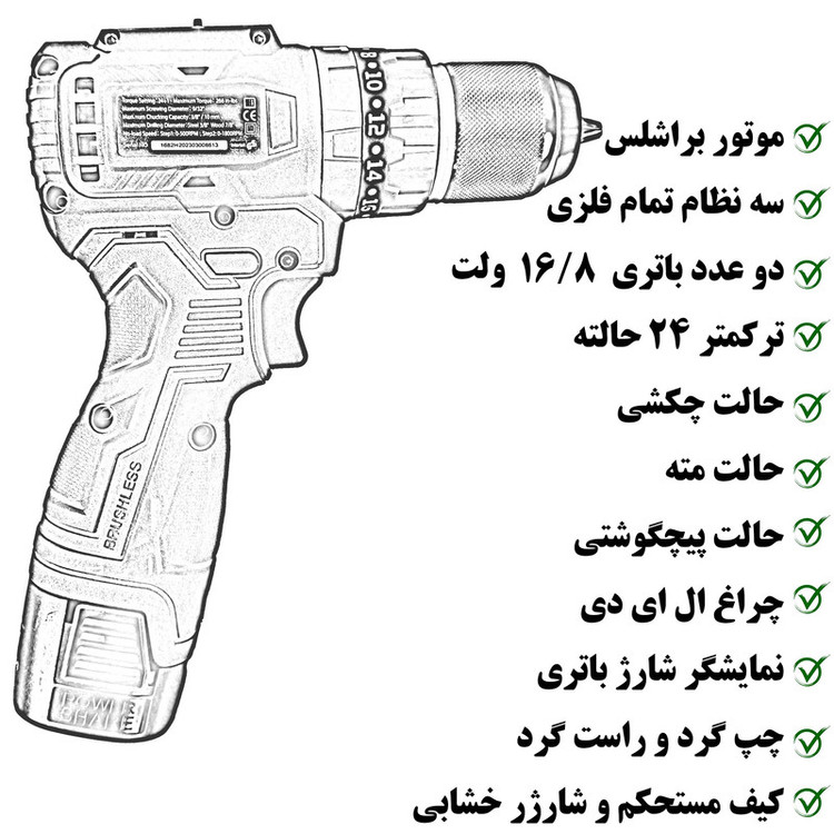ویژگیهای دریل: سیستم گردش چپگرد , سیستم گردش راستگرد , قابلیت کنترل سرعت , قفل سوییچ