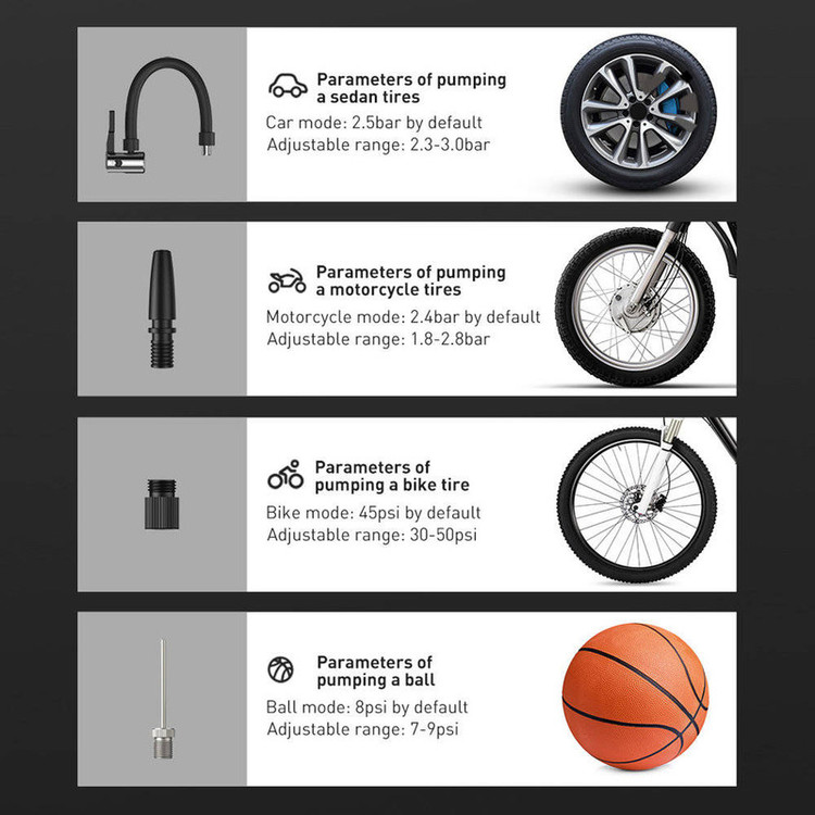 دارای چراغ LED | مناسب برای ماشین، موتور، دوچرخه، توپ | تنظیم باد به صورت خودکار و دستی | تنظیم باد فقط با فشار یک دکمه | طول کابل شارژر فندکی: 3 متر