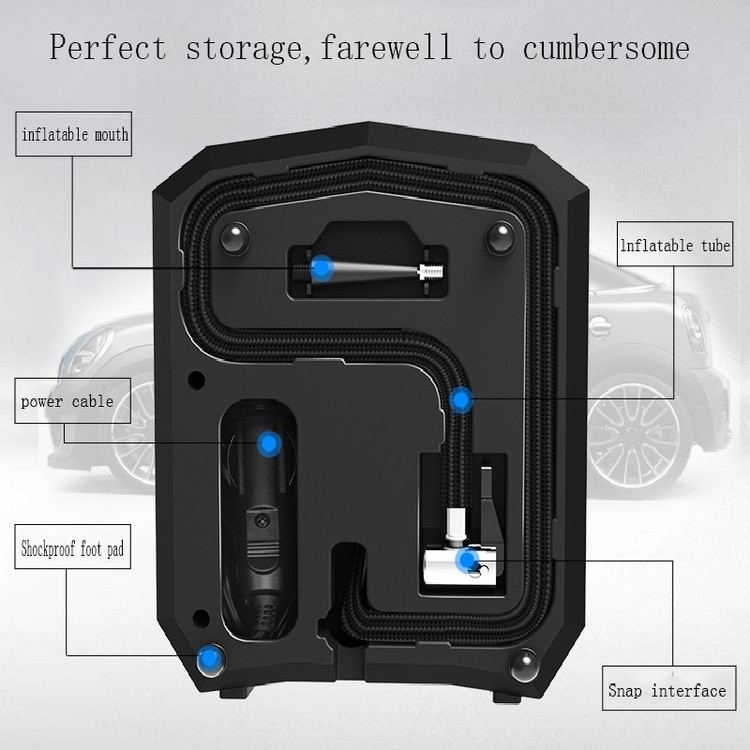 جنس: پلاستیک + فلز رنگ: مشکی + آبی ولتاژ: 12 ولت DC قدرت: 120 وات جریان هوا: 35 لیتر در دقیقه حداکثر فشار: 150 psi منبع تغذیه: فندکی ماشین کابل برق: 3M
