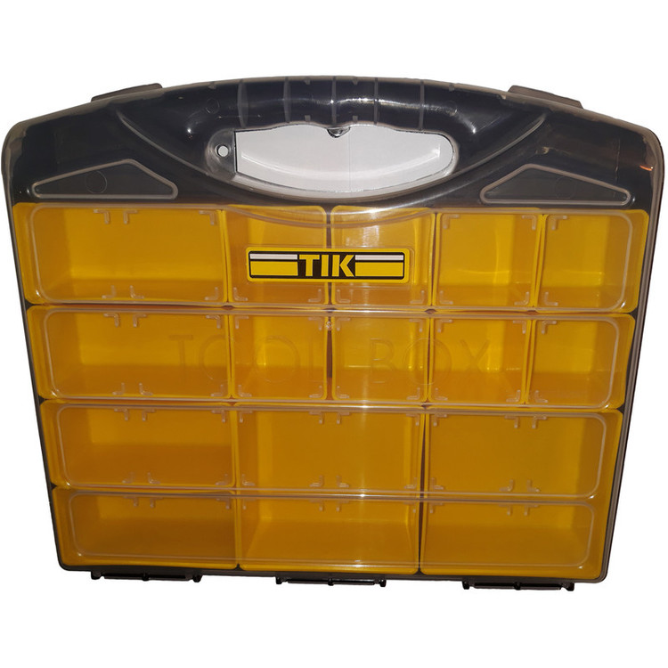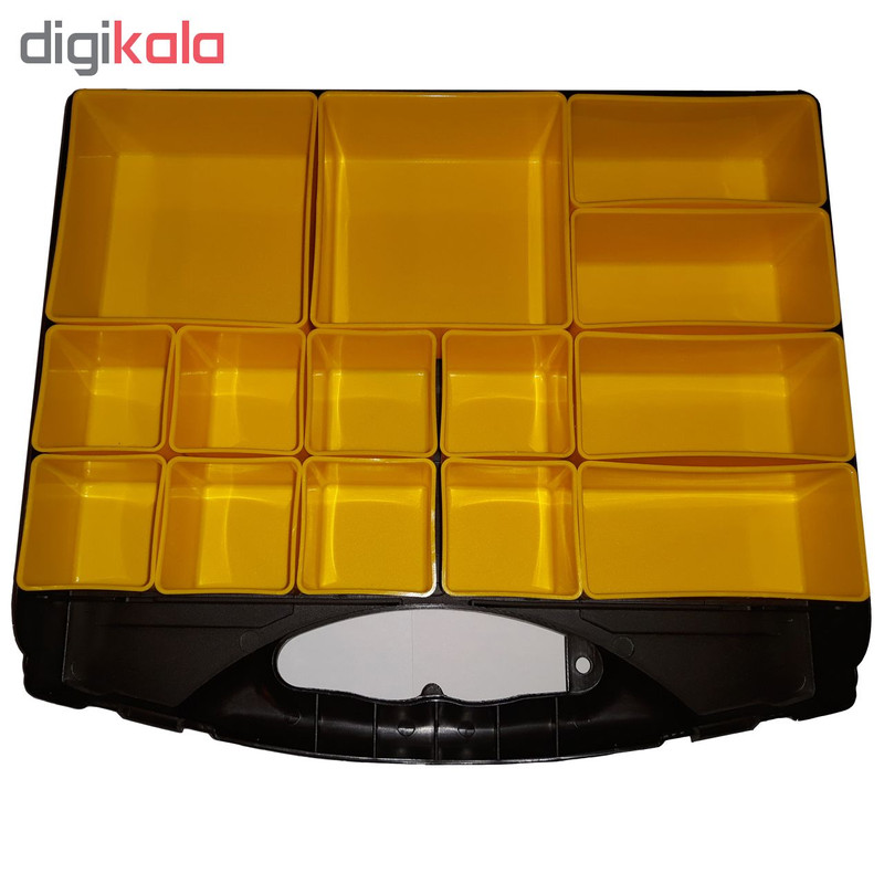دارای14 محفظه در سایزهای مختلف به منظور کارایی بیشتر در شفاف استحکام مناسب طراحی شده به صورت کیف دستی جعبه ابزار چند منظوره دارای دو قفل که هنگام بستن در جعبه به صورت خودکار قفل میشود.