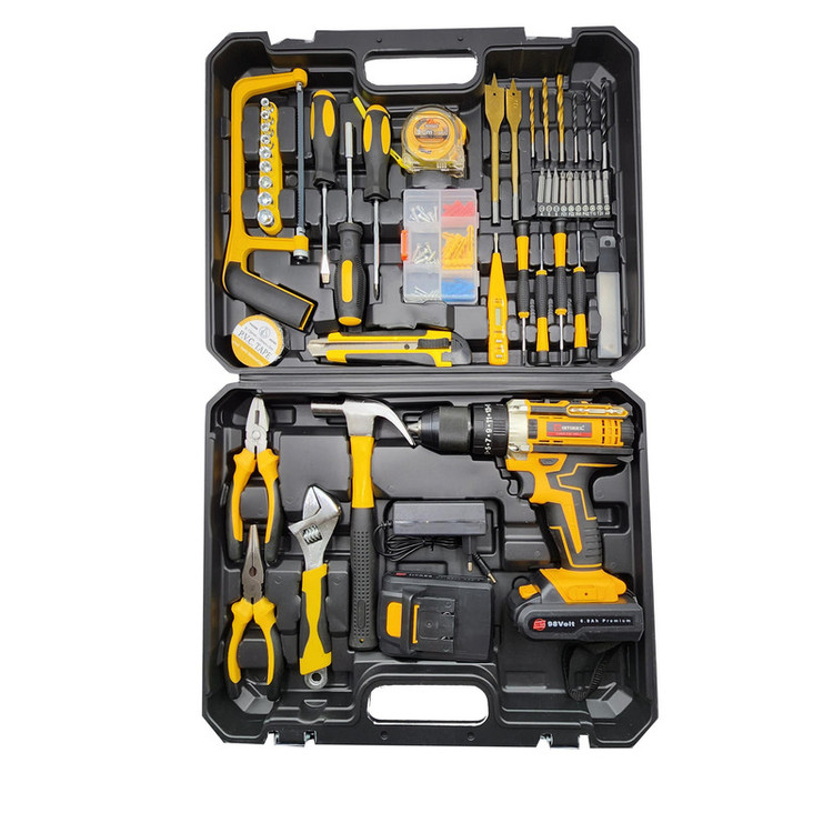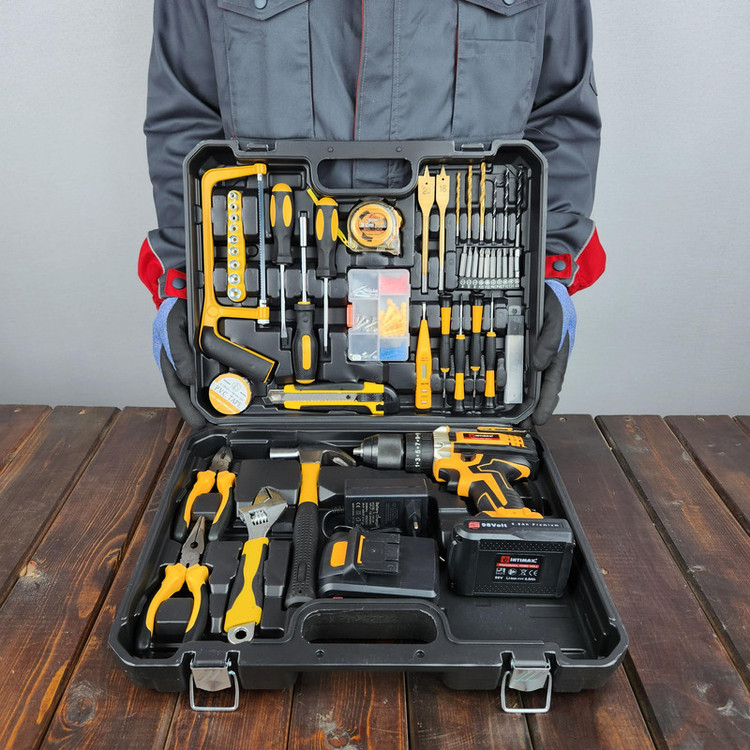 این دستگاه مجموعه ای کامل به همراه انواع ابزار الات جهت تمامی امور خانگی، اداری و ... می باشد که دریلی چکشی با سه نظام 13 میلیمتری تمام فلزی دارد که برای کارهای متعدد و سخت قابل استفاده است. گیربکس این دریل تقویت شده و بسیار قدرتمند است و از عهده امور مختلف بر میآید. این دستگاه دارای دو عدد باتری لیتیوم یون 98 ولت می باشد. دریل با گشتاور فوق العاده 35 الی 60 نیوتن متر می باشد. دارای دریل با سرعت 0 الی 600 و 0 الی 1500 دور بر دقیقه می باشد.باتری ها تولید جدید و دستگاه دارای دیمر و تنظیم سرعت می باشد. دارای چراغ جهت کار در محیط های تاریک می باشد قابلیت چپگرد و راستگرد دارد دارای کلیه ابزارهای مصرفی شامل؛ آچار فرانسه سایز 8، انبردست، دمباریک، چکش، بکس تک سایز 4 تا 13 میلیمتر، متر 3 متری، پیچ گوشتی دوسو و چهارسو سایز بزرگ، مته آهن سایز 3، 4 و 5 ، مته چوب سایز 3، 4 ،5 میلیمتر، مته برگی سایز 16 و 20 ، دارای 9 عدد نوک پیچ گوشتی، تبدیل نوک پیچ گوشتی به بکس، چسب برق، کاتر، فازمتر دیجیتال، 5 عدد تیغ کاتر، دو سایز پیچ گوشتی موبایلی دو سو و دو سایز پیچ گوشتی موبایلی چهارسو، کمان اره چوب و فلز، مجموعه سایزبندی پیچ و رولپلاک می باشدکیفیت عالی می باشد همراه کیف BMC حرفه ای عرضه میگردد
