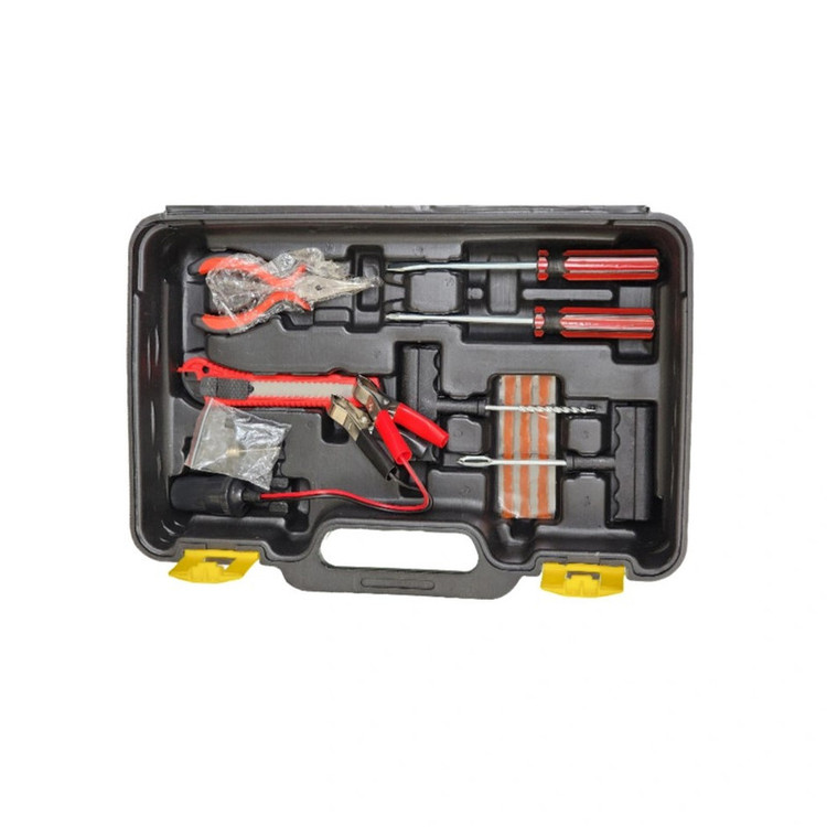 یک جفت دستکش. چراغ قوه بر روی دستگاه.کابل باطری به باطری . سه سری نازل باد. شلنگ فنری. کاتر.پیچ گوشتی دو سو.پیچ گوشتی چهارسو. دم باریک چسب مایع ابزار پنچرگیری کیف BMC با کیفیت