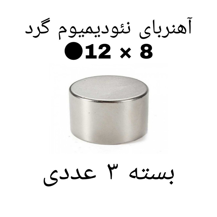 سایر توضیحات: آهنربا نئودیمیوم گرد به قطر ۱۲ میلیمتر و ضخامت ۸ میلیمتر