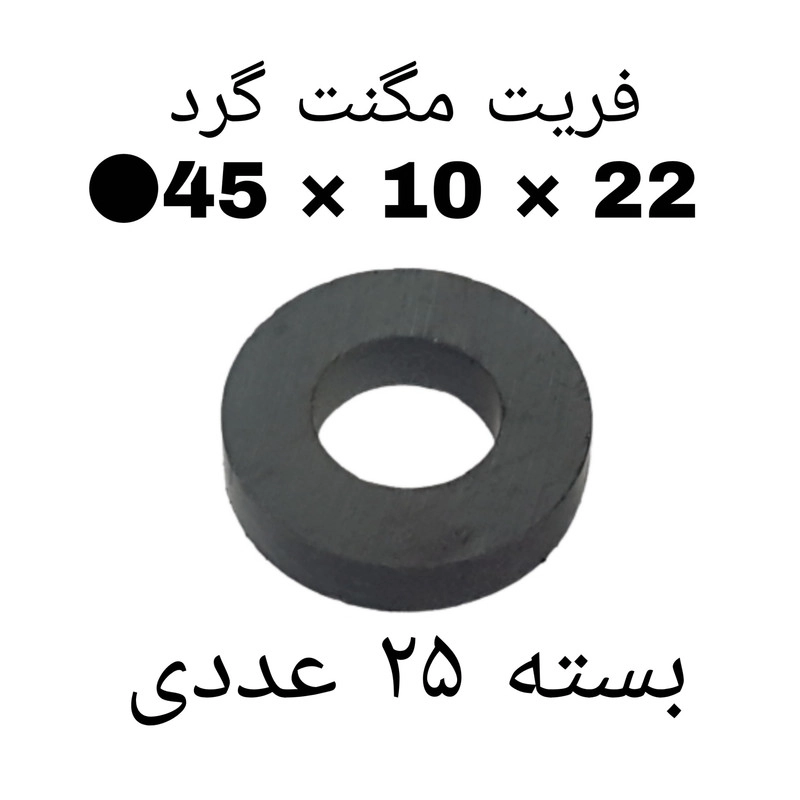 سایر توضیحات: آهنربای فریت گرد به قطر ۴۵ میلیمتر ، ضخامت ۱۰ میلیمتر و سوراخ ۲۲ میلیمتر