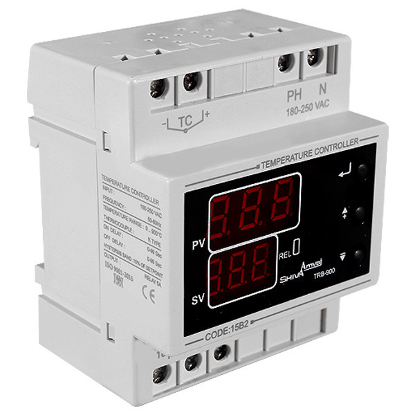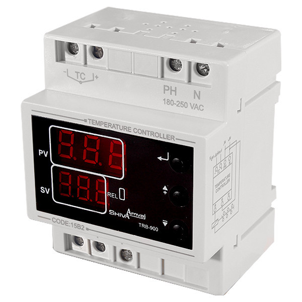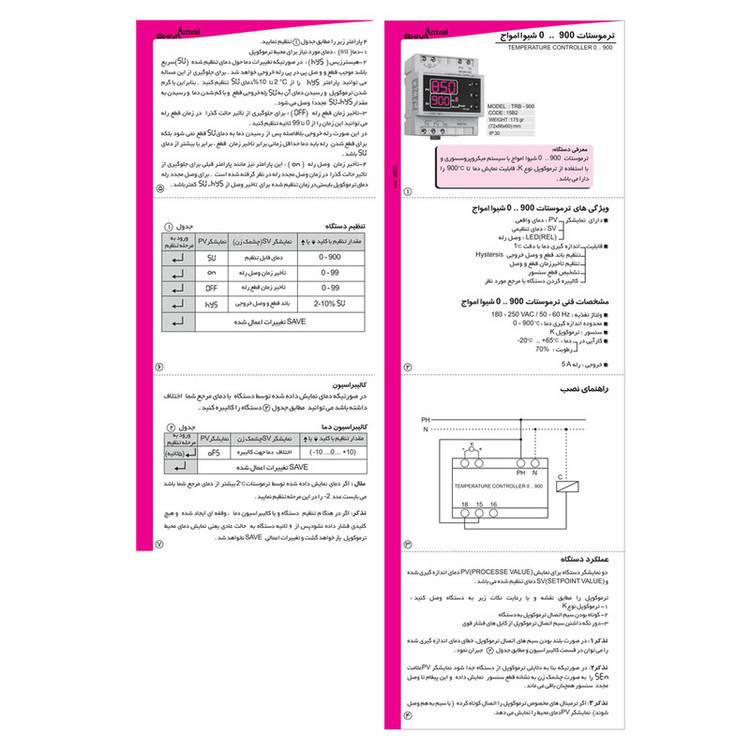 داراي نمايشگرهاي : PV:دماي واقعي و SV: دماي تنظيمي و (LED(REL: وصل رله مي باشد. خروجي : رله دو كنتاكت 5A IP 30 ولتاژ تغذيه : 180VAC-250VAC /50-60Hz