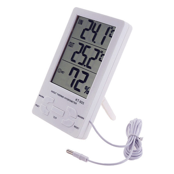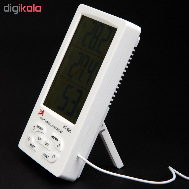 دارای پایه رومیزی و گیره نصب به دیوار می باشد. دارای سیم متصل به سنسور جهت اندازه گیری دمای محیط ثانوی است. اندازه LCD 6.6*9.2 cm