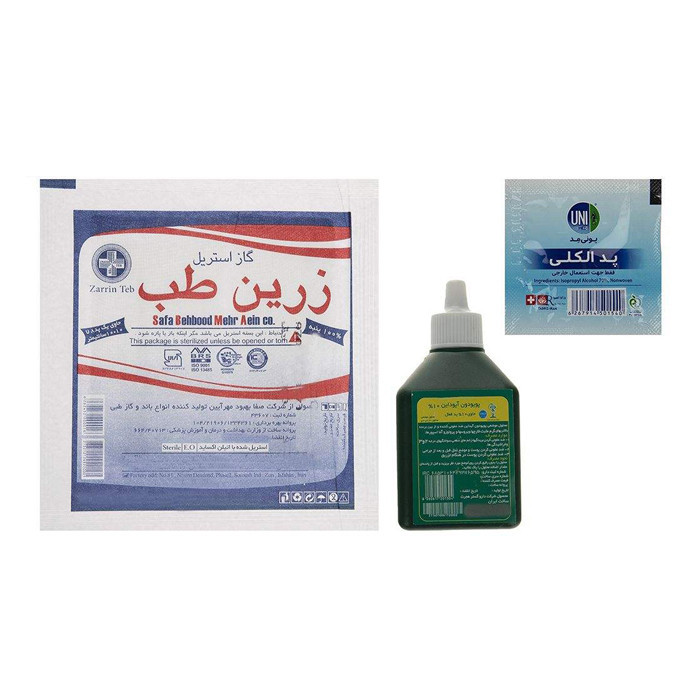 چسب زخم , گاز استریل , بتادین , باند کشی , پد الکلی , پنبه , باند دور بافت , دستمال کاغذی