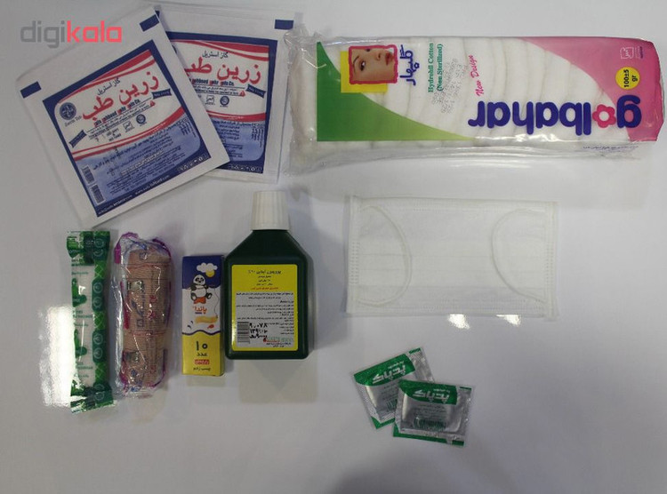 محتویات جعبه کمکهای اولیه: ماسک , چسب زخم , گاز استریل , بتادین , باند کشی , پد الکلی , پنبه , باند دور بافت