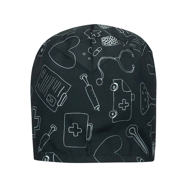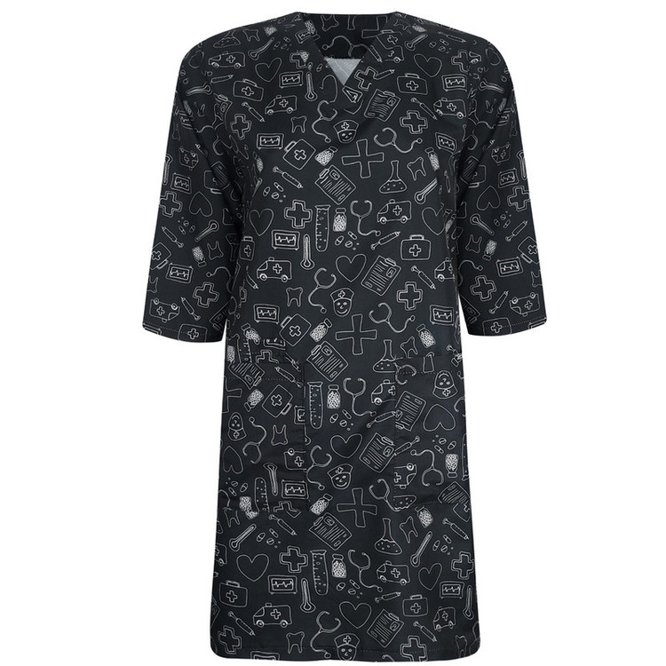 جنس پارچه تترون , مدل اسکراب مشکی طرح دار + کلاه به همراه دو جیب پایین سمت چپ و راست و یک جیب کوچک بالای جیب راست