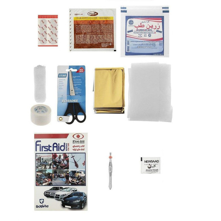 محتویات جعبه کمکهای اولیه: چسب زخم , پنس , گاز استریل , باند زخم , چسب باند , دستکش لاتکس , پد الکلی , بروشور آموزشی , گاز وازلینه , باند دور بافت , پتوی نجات , پانسمان آماده