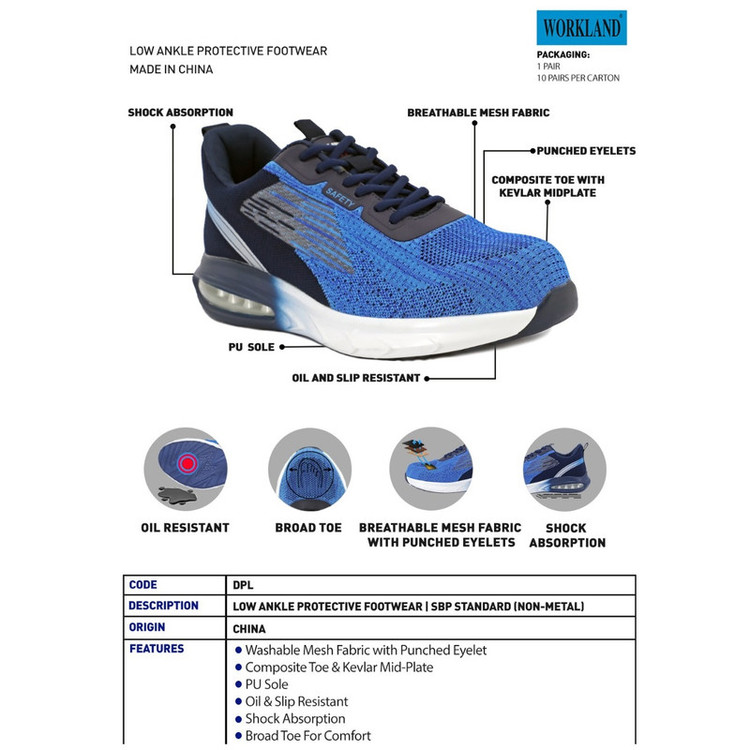 این کفش از برند WORKLAND تولید شده در کشور چین می باشد . وزن این کفش نسبتا سبک بود و هر لنگه آن ( سایز 43 ) تنها 440 گرم وزن دارد . طراحی ان بسیار اسپرت و ظریف بوده و اصلا به نظر کفش ایمنی بنظر نمی رسد . جنس رویه آن ترکیبی از پارچه بافت مش تنفس پذیر با طراحی بسیار زیبا و چشمگیر می باشد . سرپنجه این کفش از جنس کامپوزیت است . زیره کفش از جنس PU , آنتی شوک و ضد لغزش بوده و دارای خاصیت انعطاف پذیری بسیار خوبی می باشد . در قسم پاشنه پا یک فضای کپسولی شک طراحی شده که به نرمی کفش هنگام قدم برداشتن بسیار کمک بالایی می کند . با توجه به اینکه در این کفش هیچ گونه فلزی به کار نرفته است ، می تواند برای در برابر جریانم برق فشار ضعیف تا 300 ولت ، عایق مناسبی باشد .