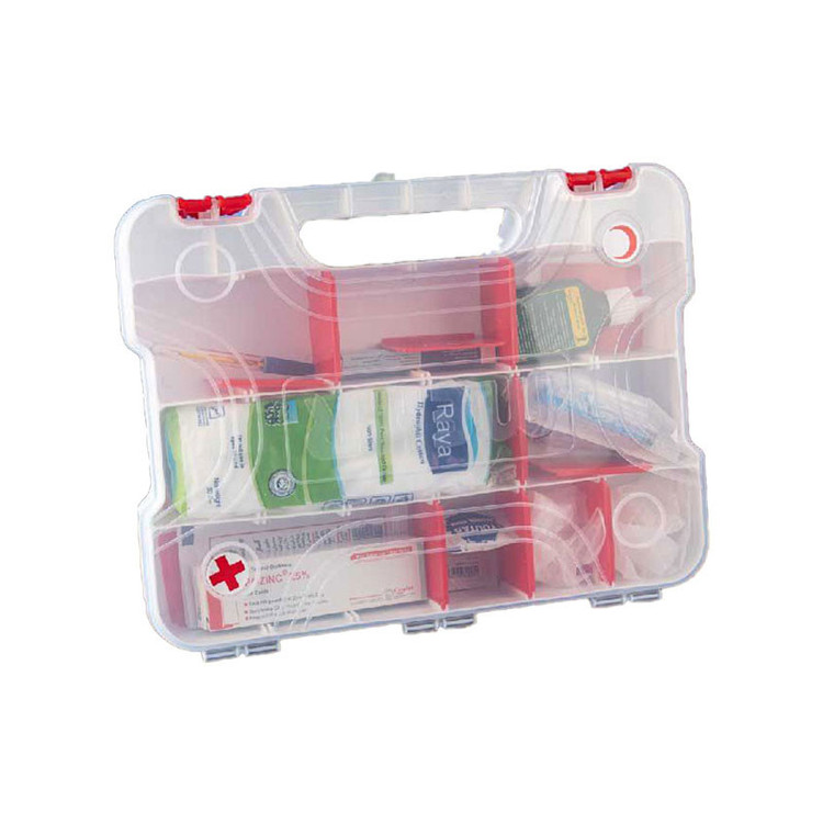 محتویات جعبه کمکهای اولیه: باند زخم , بتادین , پد الکلی , پنبه , چسب حلقه ای , چسب زخم , دستکش لاتکس
