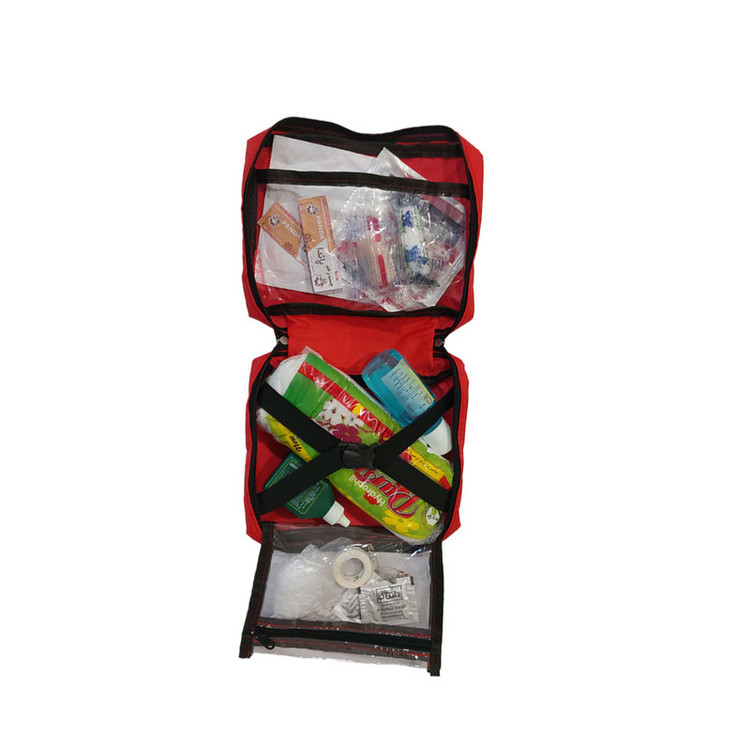 محتویات جعبه کمکهای اولیه: باند کشی , بتادین , پد الکلی , پنبه , چسب حلقه ای , چسب زخم , دستکش , سنجاق قفلی , گاز استریل , گاز وازلینه