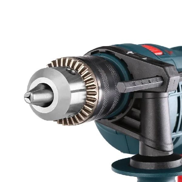 توان موتور 750 وات قابلیت سوراخکاری چکشی مجهز به کلید الکترونیک دیمردار دارای سه نظام آچاری 13 میلیمتری سرعت در حالت بیباری 0 تا 2800 دور در دقیقه همراه با دسته جانبی گردان ارگونومیک 360 درجه