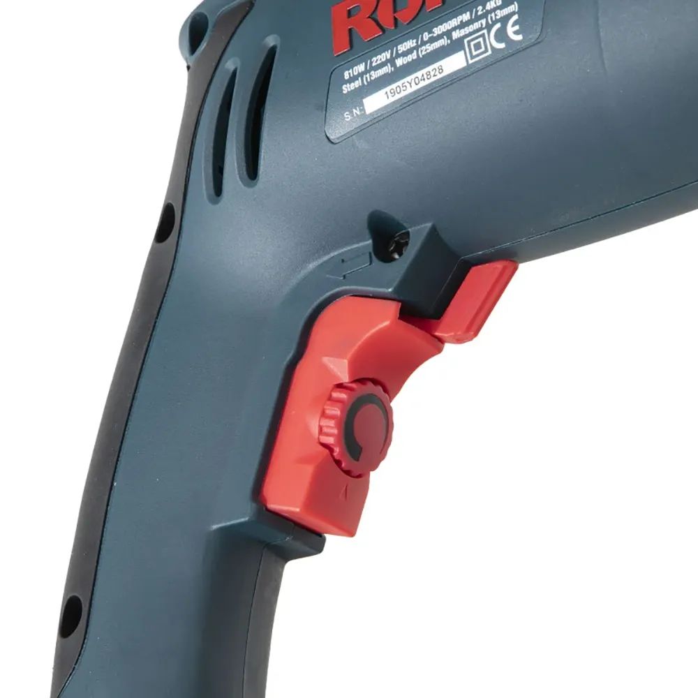 Ronix 2210C Impact Drill دارای کلید الکترونیک دیمردار جهت کنترل سرعت توان موتور: 810 وات سرعت در حال بی باری: 0-3000 دور در دقیقه چپ گرد و راستگرد دارای دسته گردان 360 درجه دارای سه نظام آچاری 13 میلیمتری