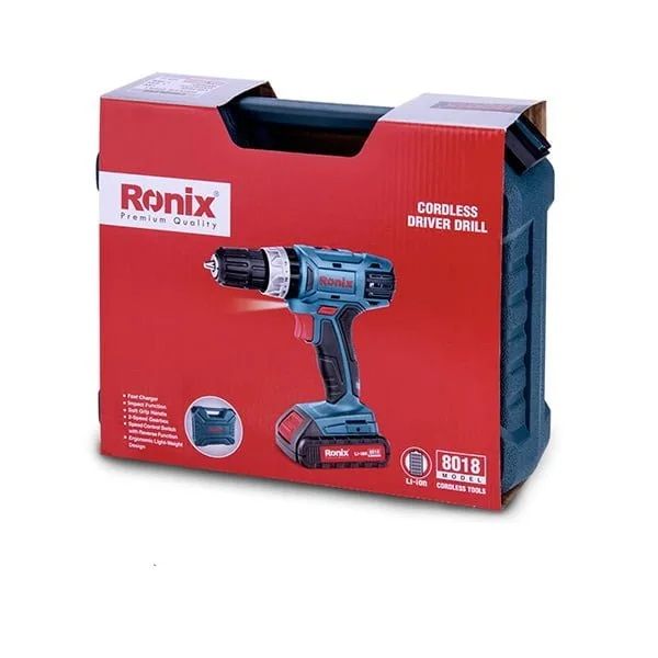 دریل پیچ گوشتی شارژی رونیکس مدل RS-8018، مجهز به موتور قدرتمند جهت انجام کارهای سنگین و طولانی در صنایع مختلف است که مجهز به باطری لیتیومی 18 ولت با عمر طولانی که این باطری 1.5 آمپری در مدت 1.5 ساعت شارژ می شود. این دریل پیچ گوشتی مجهز به گیربکس دو دور صنعتی جهت افزایش اثربخشی کارکرد با دو عملکرد در پیچ کاری،سوراخکاری و سوراخکاری چکشی می باشد که در یک حالت سه نظام را با سرعت 0-400 و در حالت دیگر با سرعت 0-1350 به چرخش در می آورد، از دیگر ویژگی های این ابزار می توان به سیستم خنک کنندگی بهینه موتور جهت طول عمر بیشتر دستگاه و چراغ LED جهت کارکرد در محیط های کم نور و تاریک برای دقت بیشتر اشاره کرد. دریل رونیکس مدل RS-8018 همراه با 2 عدد باطری لیتیومی و شارژر مجهز به سیستم شارژ سریع و قطع کن هوشمند و کیف BMC مقاوم و لوازم همراه جمعا به تعداد 53 پارچه عرضه می گردد.